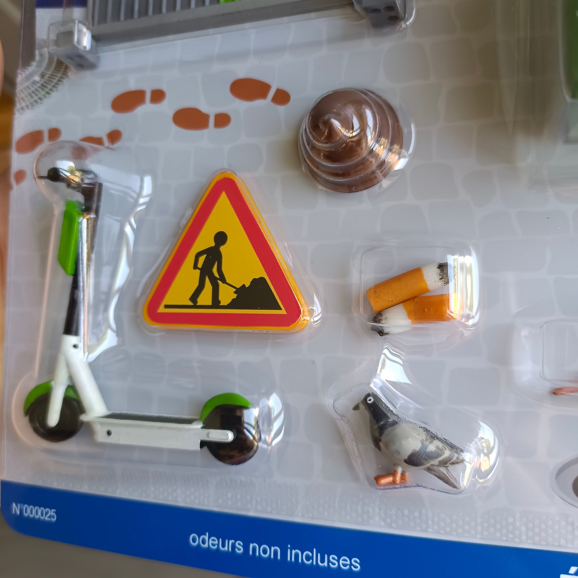 Contient : une barrière de chantier, une trottinette électrique libre-service, un panneau de travaux, deux mégots, une poubelle, une crotte, un rat et un pigeon.